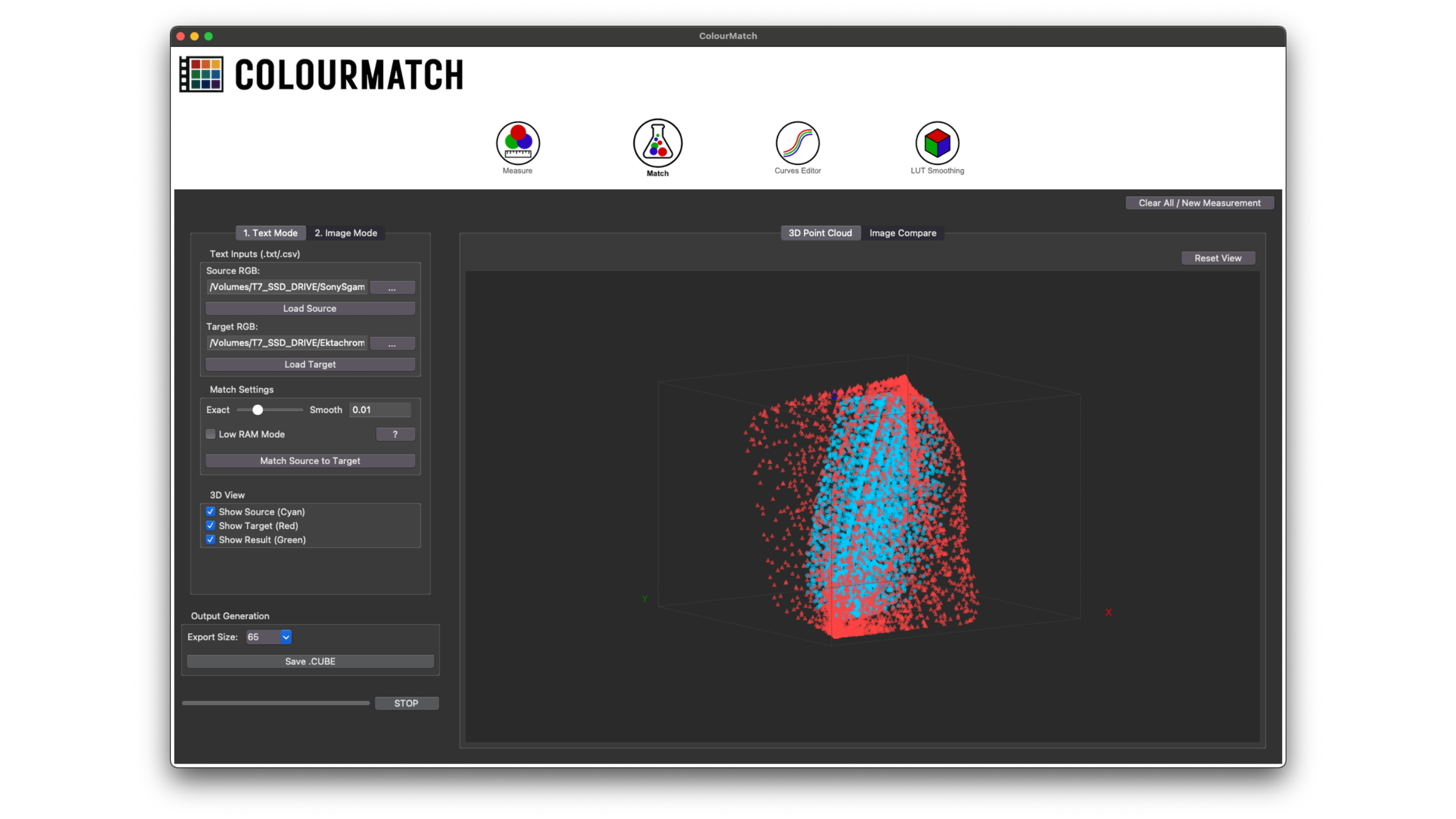 The Core Algorithm is found in the “Match” tab. Here, you input your Source and Target datasets and visualize them side-by-side in 3D space. The algorithm then calculates the necessary warp to map the Source dataset to the Target. The final color transformation is stored as a 3D LUT for use in DaVinci Resolve, Premiere, Final Cut, or any compatible NLE.