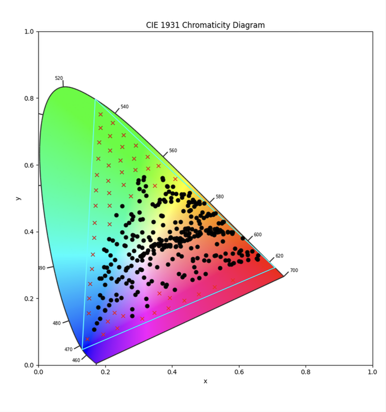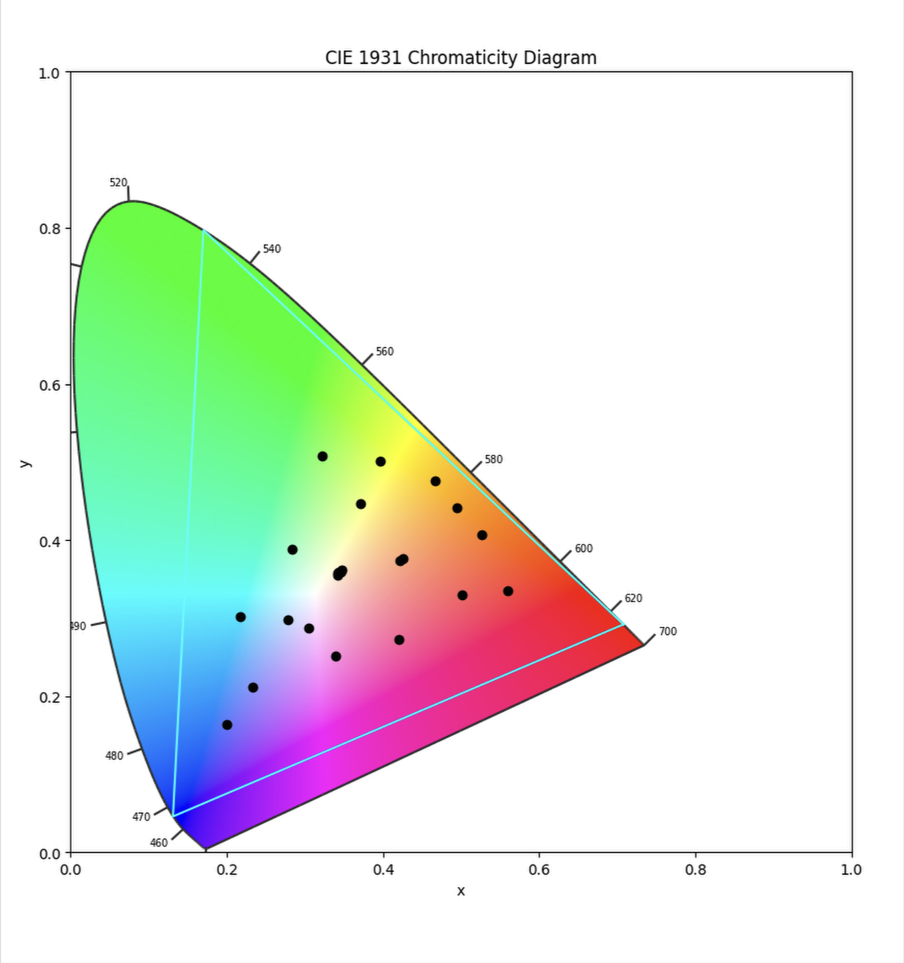 The color stimuli produced by an object and illuminated by a light source can be measured with spectrometer and plotted on the 1931 CIE graph. The 1931 CIE graph gives us a visual representation of the visible spectrum (the spectrum of light that humans can see). The image below shows the plot of the color patches of a Color Checker Classic illuminated by D50 illuminant (daylight).